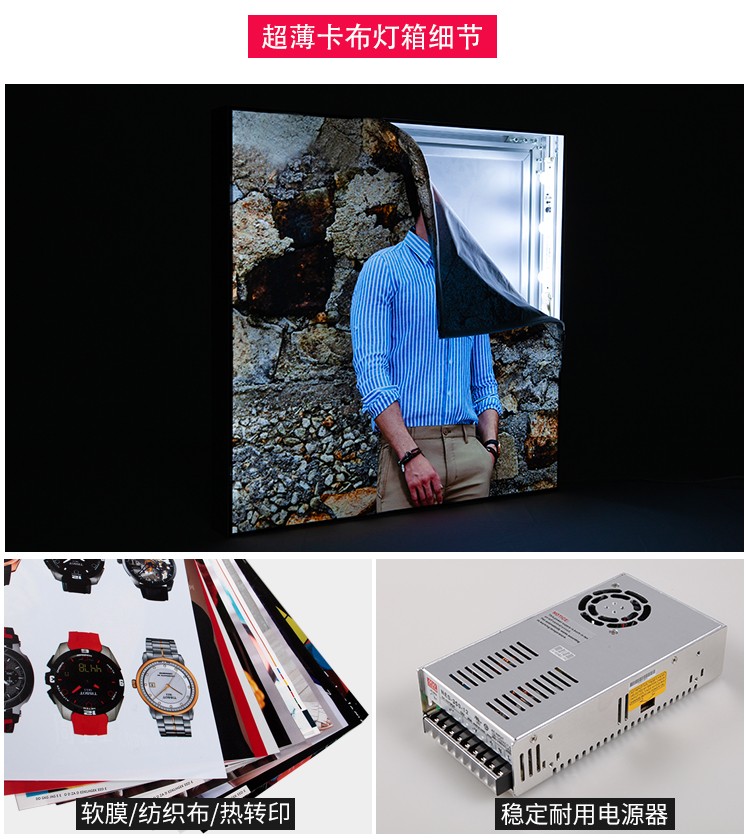 產(chǎn)品簡(jiǎn)介:超薄卡布燈箱,經(jīng)典超薄的65mm厚度,燈箱無邊框設(shè)計(jì),可以全面展示廣告畫面,高亮節(jié)能的漫反射LED燈與高清的熱轉(zhuǎn)印畫面,讓整個(gè)店鋪彰顯出高貴與奢華。...