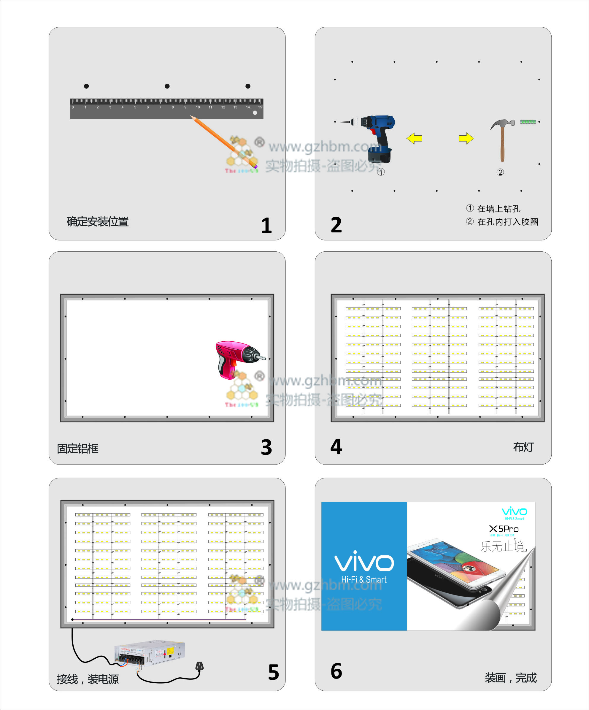 4:接線出線——LED燈/電源器電線分別相應對接,最后在鋁框底部出電源線。