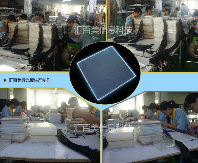 導(dǎo)光板是利用光學(xué)級(jí)的亞克力/PC板材,然后用具有極高反射率且不吸光的高科技材料,在光學(xué)級(jí)的亞克力板材底面用UV網(wǎng)版印刷技術(shù)印上導(dǎo)光點(diǎn)。利用光學(xué)級(jí)亞克力板材吸取從燈發(fā)出來(lái)的光在光學(xué)級(jí)亞克力板材表面的停留,當(dāng)光線射到各個(gè)導(dǎo)光點(diǎn)時(shí),反射光會(huì)往各個(gè)角度擴(kuò)散,然后破壞反射條件由導(dǎo)光板正面射出。通過(guò)各種疏密、大小不一的導(dǎo)光點(diǎn),可使導(dǎo)光板均勻發(fā)光,從而提高光的均勻度和光效率。