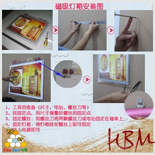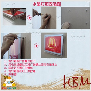水晶燈箱類:包括水晶燈箱何感應(yīng)燈箱,這2種燈箱的安裝方法一致的,大概是這樣的:首先找好安裝的墻體,然后將燈箱上的廣告螺絲松下固定到墻體上,再將燈箱整體對(duì)著螺絲孔固定(如圖)