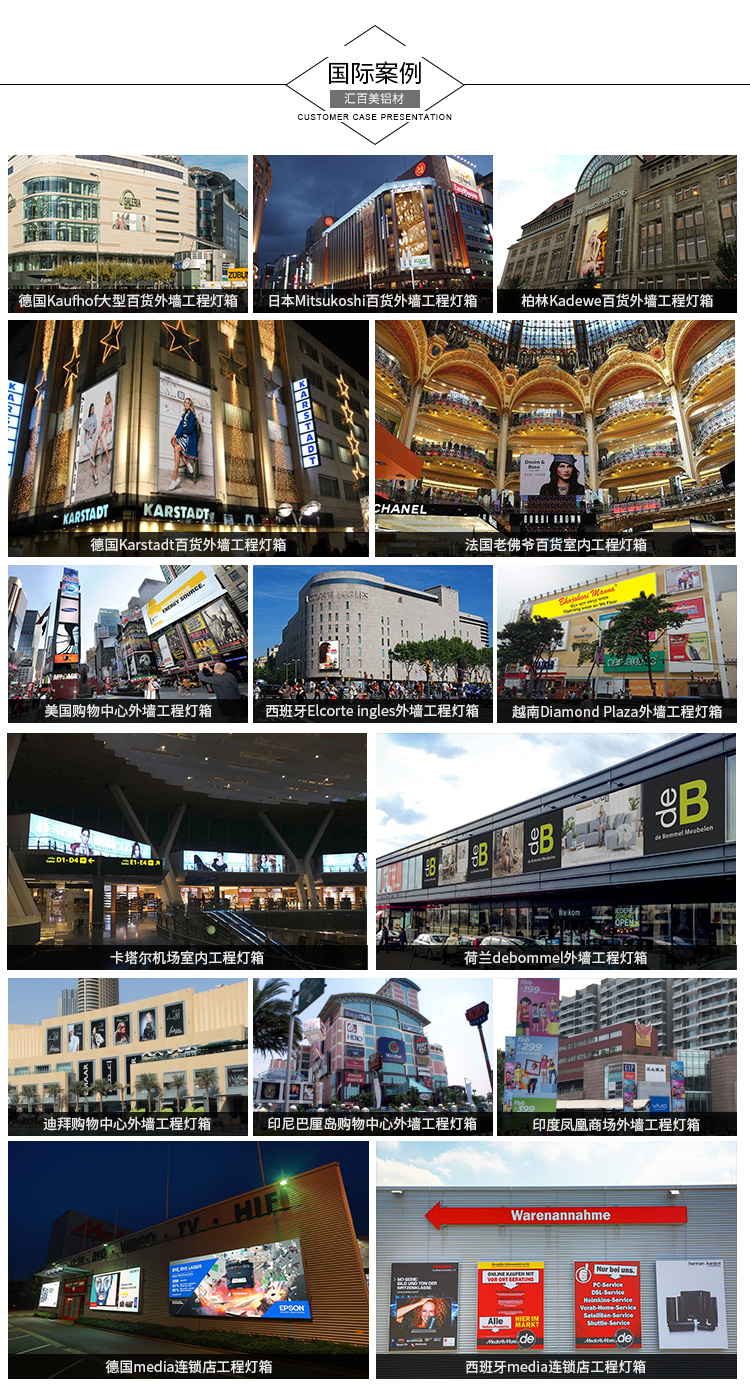 匯百美十年來(lái)專注于為客戶提供工程拉布燈箱一站式服務(wù),提供包括燈箱鋁型材、LED燈、廣告畫面、電源器的一站式采購(gòu)。
