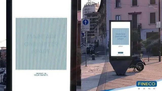 為了凸顯其投資的安全性,借助了疫情時期要保持一米的安全距離,然后設(shè)計了一個只有離廣告牌一米距離,才能看清廣告內(nèi)容的戶外廣告,從而傳達了—— 安全是現(xiàn)在有價值的投資。