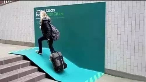 樓梯處的斜坡廣告牌為提行李箱的人們提供便利、
